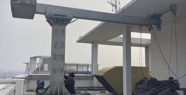 Pembuatan dan instalasi unit gondola berdasarkan kebutuhan gedung, dengan perhitungan teknis, metode kerja terkontrol, dan pengawasan keselamatan kerja.